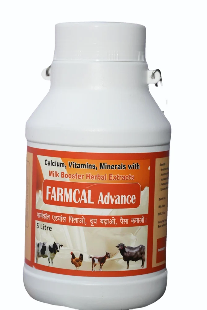 FARMCAL Advance is a scientifically formulated animal feed supplement enriched with Calcium, Phosphorus, essential Vitamins, Minerals, and natural Milk Booster Herbal Extracts, designed to improve the health, productivity, and performance of dairy cattle, poultry, and other livestock. This powerful nutritional solution helps in enhancing milk yield, strengthening bones, boosting immunity, and improving overall reproductive performance in animals. FARMCAL Advance is the ultimate choice for farmers and dairy owners looking for a reliable supplement to increase profitability and animal wellness. The balanced formula contains high levels of Calcium for bone strength, Phosphorus for energy metabolism, Vitamin A for vision and immunity, Vitamin D3 for calcium absorption, Vitamin B12 and Lysine for growth, Methionine for protein synthesis, Biotin for skin and hoof health, and herbal extracts like Asparagus racemosus, Withania somnifera, and Mucuna pruriens for natural milk boosting properties. Together, these nutrients and herbs work synergistically to improve feed efficiency, reduce infertility, prevent milk fever, and promote higher yield and healthier livestock.