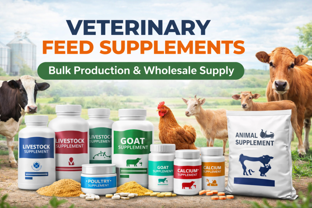 Welcome to our trusted Veterinary Feed Supplements Manufacturing Company, where quality nutrition meets scientific formulation. We are a dedicated manufacturer of veterinary feed supplements, supplying high-quality products in bulk quantities to dairy farms, poultry farms, livestock owners, distributors, and veterinary suppliers.